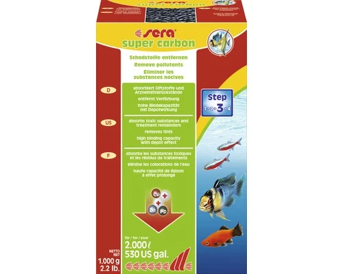 Absorbeert gif- en kleurstoffen snel en betrouwbaar uit het aquariumwater. De gele verkleuring van het aquariumwater verdwijnt. Het water wordt kristalhelder. Sera super carbon heeft geen invloed op de pH-waarde. Ssera super carbon is fosfaat- en nitraatvrij.